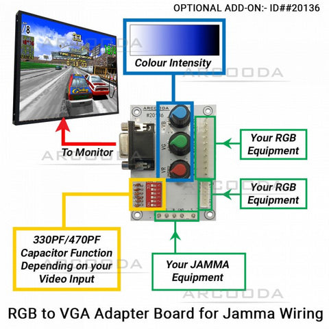 - RGB adapter PCB for plug and play with almost any CRT tube monitor wiring. This board also offers fine tuning of color via red,blue,green color potentiometers